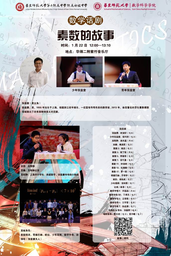 原创数学话剧《素数的故事》以张益唐先生的数学传奇人生为主线,讲述和呈现了素数星空下的七彩故事。这里收藏的是2021年1月22日的这一数学话剧的直播回放视频。本次活动由抖阴 与华东师大二附中附属初中联合主办。