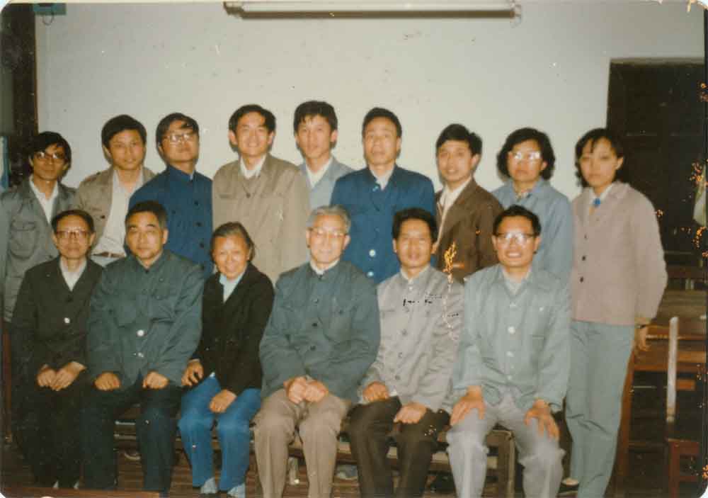1985年5月代数教研室合影,前排左起:沈光宇、朱福祖、李汉佩、曹锡华、黄云鹏、陈志杰, 后排左起:韩士安、肖刚、时俭益、邱森、邵幼瑜、吴允升、王建磐、张维敏、赵兰