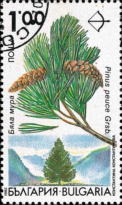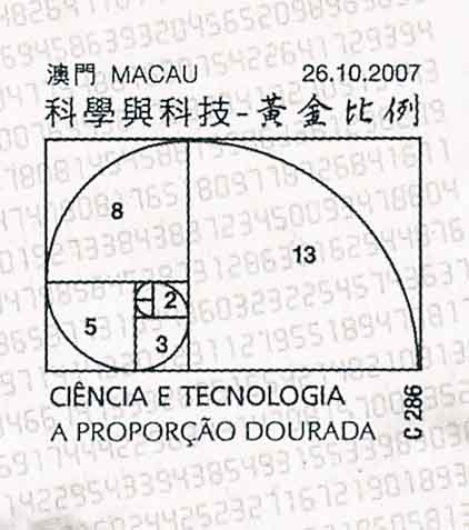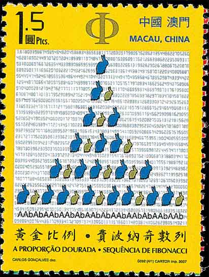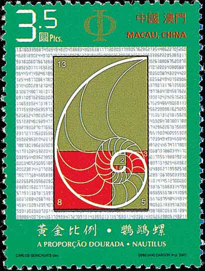 斐波那契数列并不只是数学家们的臆造, 已经发现很多自然现象符合斐波那契数规律. 特别在植物世界中, 几乎所有花卉的花瓣基数是斐波那契数. 如菊花是2基数; 兰花和鹤望兰都是3基数; 梅花、凤凰木和扶桑等是5基数. 我们都知道松树的针叶数, 只有两针松(图4, 前苏联邮资信封), 三针松(图5, 马拉维邮票)和五针松(图6, 保加利亚邮票), 没有四针松. 观察向日葵的花盘, 可发现其种子排列是正反两个方向相嵌在一起的螺旋线(图7), 而螺旋线的数目, 一般是34和55、55和89或89和144, 这每组数字都是斐波那契数列中相邻的两个数. 此外, 在植物的叶子、枝条、果实、种子等形态特征上都可发现斐波那契数的存在. 上述图1、3、7是澳门《黄金比例》这一套邮票中的3枚邮票.