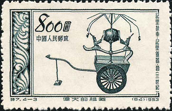 我国科学家对圆和圆周率的应用与研究有着悠久的历史. 图1是在甘肃出土的马家窑彩陶 — 四系罐, 它是五千年前(新石器时代晚期)制作的器皿, 罐体是旋转体, 罐上的纹饰有: 圆, 而且是同心圆; 四周绘制具有周期的波浪线. 说明了我国劳动人民对圆早就有了深刻的认识, 并能应用于生活和装饰. 图2是记里鼓车, 它发明于汉代. 车中装有传动齿轮和凸轮杠杆等机械, 车行一里, 车上木人击鼓一下. 只要倾听鼓声, 就知道车已行了多少路程. 这说明当时已能计算圆周长, 并据此设计车轮大小.