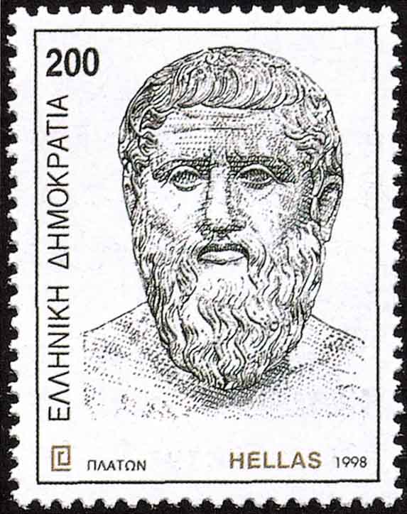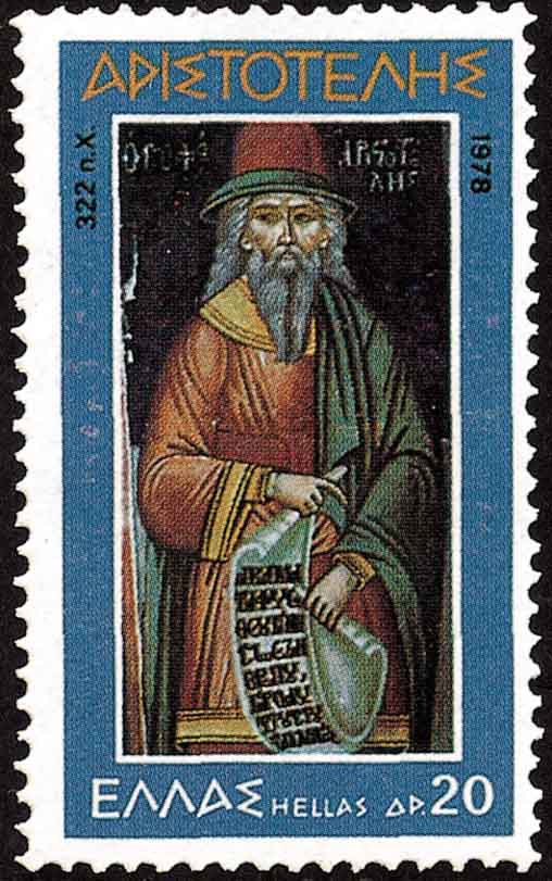 古希腊哲学家亚里士多德(Aristotle, 公元前384-322, 图3)是柏拉图的学生. 在数学上, 他曾给出√2不是有理式a/b (a、b为整数)的证明(图1、2、3均为希腊邮票).