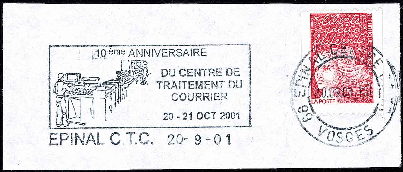 在欧美一些发达国家,当邮局收到寄信者的邮件时,都在邮件某一固定位置上打印条形码(图5下端,美国,2001年实寄),这有利于用计算机来分拣邮件(图6,法国邮戳,2001)。