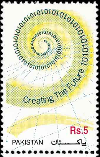 我们日常用的是十进位制,即逢十进一位。而在电子计算机上用的是二进位制,因为电子计算机是依靠电流来运作的。对于一个电路节点来说,电流通过只有通电和断电两种状态。 计算机上信息存储常用磁盘,而磁盘上的每一个记录点,也只有磁化和未磁化两种状态。如果用光盘记录信息,光盘上每一个信息点的物理状态也只有凹和凸两种, 它们分别起着聚光和散光的作用。由此可见,计算机上所使用的各种介质只有两种状态。对这两种状态分别用0和1(图1为巴基斯坦邮票)来表示。 这就使得二进位制成为电子计算机各项工作的基础。通常,我们向电子计算机输入数据,都要先被转换成二进位制后,计算机才能按人们的设计进行工作。 图2是以0、1为画面背景的邮票,它是为2003年在匈牙利布达佩斯举办的世界科学论坛而发行的。