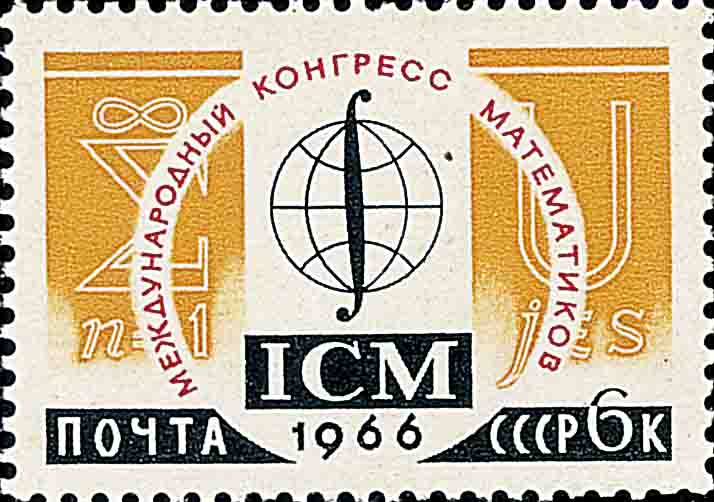 第 15 届国际数学家大会于 1966 年在前苏联的莫斯科召开, 图 1 是前苏联邮政发行的一枚纪念邮票, 图案当中是会标 (地球和积分符号). 国际数学家大会英文缩写``ICM''被醒目地放在中央部位, 这个缩写首次被正式使用. 两边分别是无限求和与集合求并的数学符号, 它寓意着``全世界数学家联合起来!'' 参加这次大会的数学家有四千多位, 其中苏联东欧与西欧北美的数学家大约各占一半, 这次东西方相会已被载入史册.