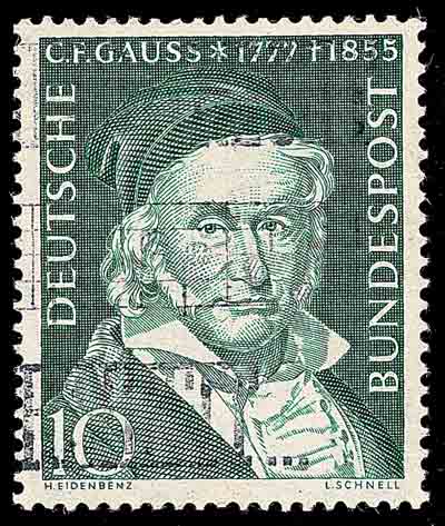 关于非欧几里得几何的创立, 在十八世纪末德国大数学家高斯 (Carl Friedrich Gauss, 1777-1855, 图 1 是德国于 1957 年发行的纪念高斯的邮票) 在几何研究中就已经发现了非欧几里得几何的存在, 但害怕不为世人所接受而怯于发表.