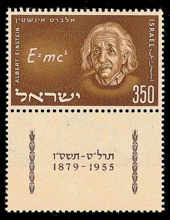 另一支非欧几里得几何是黎曼几何, 他的平行公理是: 同一平面上的任意两条直线一定相交. 著名物理学家爱因斯坦 (Albert Einstein, 1879 年出生于德国的犹太人, 1921 年获诺贝尔物理奖, 1933 年由于纳粹德国的反犹太主义, 被迫移居美国, 1955 年在普林斯顿去世. 图 5、图 6 分别是以色列和美国发行的纪念爱因斯坦的邮票) 正是对黎曼几何的研究和应用, 才使他打开了广义相对论的大门, 爱因斯坦还在 1925 年发表了《非欧几里得几何与物理学》的研究论文.